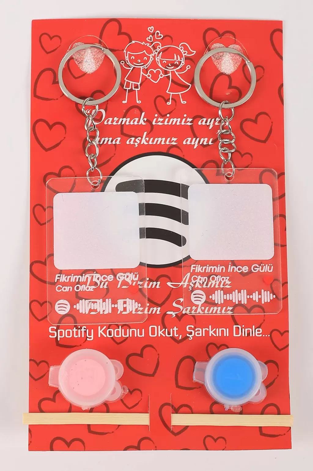 Baskıyı yapmadan önce boyanızı çubuk yardımıyla deneme kağıdına sürün, baş parmağınızla yada işaret barmağınızla boyayı yayarak eşit dağılımı sağlayın, ilk baskınızı deneme kağıdına yaparak deneme baskısı yapın. Anahtarlığa baskı işlemini yaptıktan sonra boyanın kurumasını bekleyiniz.